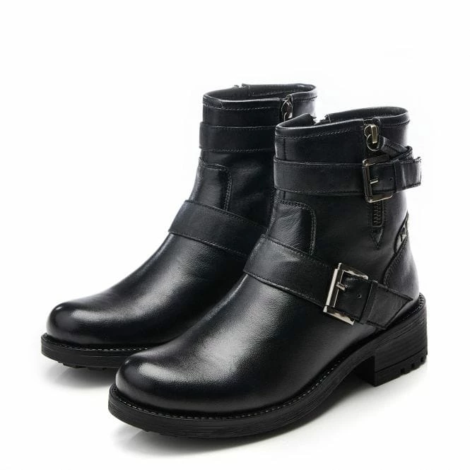 Add a new look to your outfits with Aabby, the biker style ankle boot. We love the double buckle feature, the soft round toe keeps the shoe looking feminine whilst the leather sock ensures they feel as good as they look. The inside zip allows for easy access.