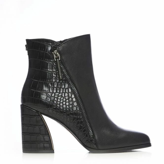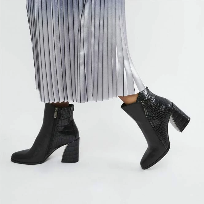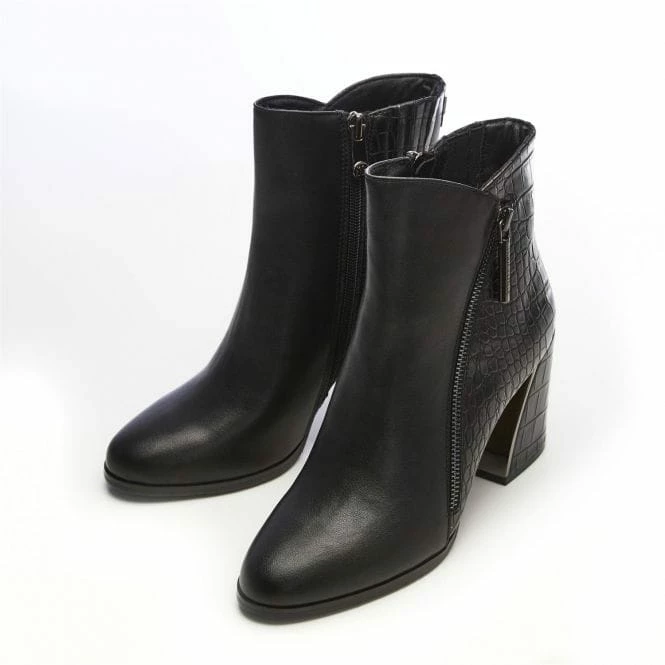 Your new favourite wide fit boot. Amy features a stunning curved block heel with a metallic inner, the contrasting textures on the shoe add further detail whilst still leaving it effortless to style. Complete with a functional inside zip and a decorative outside zip. Style with leather trousers and a blouse.