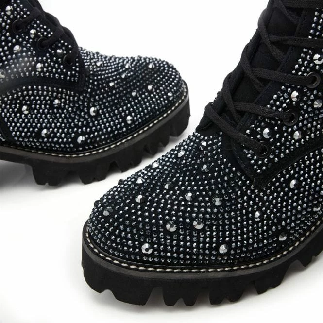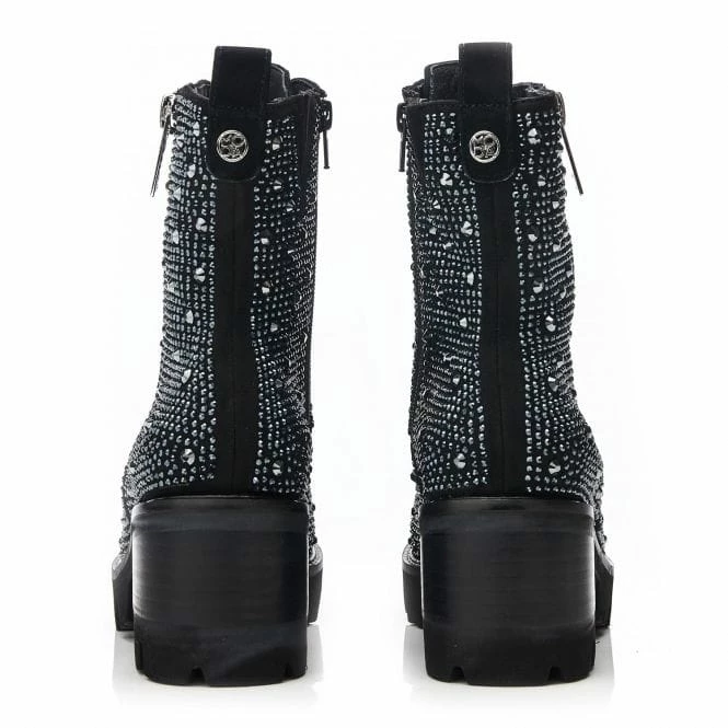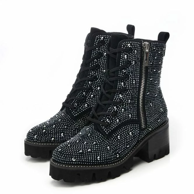 Add a touch of glamour to your look with Anaglitzi. This smart biker boot style features a wearable block heel for everyday lift. The inside zip allows you to set the laces in the perfect place, whilst the outside decorative zip adds to the impact of the boot. Adorned with different-sized hot stones, the padded leather sock and faux fur lining ensure the boot feels as luxurious as it looks. If you wear a half size, we recommend sizing down.