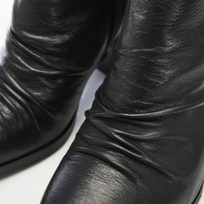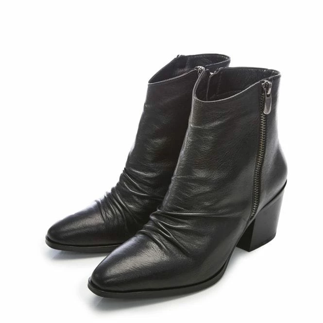 Cuban heeled Coralie. The soft, tumbled leather upper on this boot will stretch and mould to your unique foot shape for a flawless finish and comfortable wear. The ruched vamp, soft square toe and glossy finish add to the impact of this boot. Complete with a zip for easy foot entry. Perfect to pair with a midi dress.