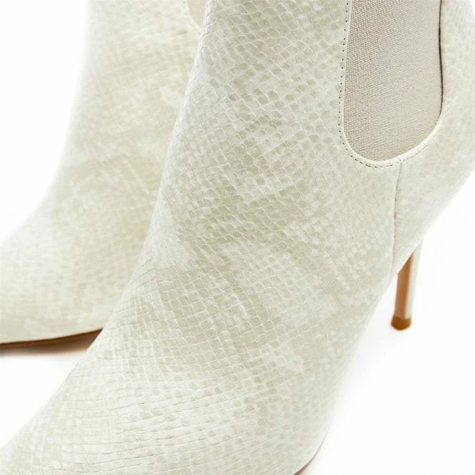 Keep up with Katerina. A high stiletto meets a sophisticated pointed toe to create this stunning ankle boot. Complete with inside zip and an elastic gusset, allowing the boot to move with you for comfortable wear. The animal print effect upper adds to the luxe vibe of the boot. Pair with a blazer dress.