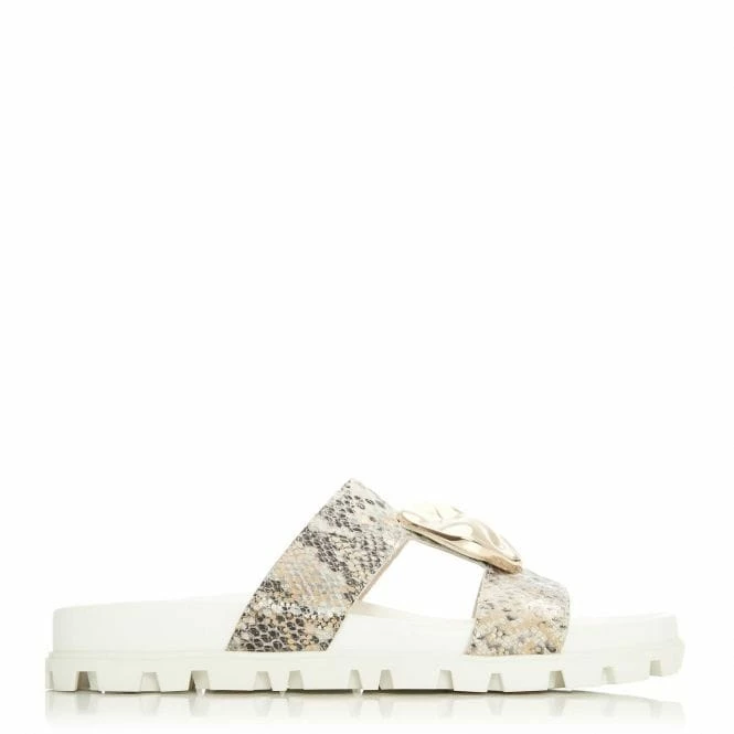 Get to know Nattie, our gorgeous chunky slider in metallic snakeskin print. The double straps keep your foot securely in place, whilst the hammered disc adds detail – catching the light and drawing more attention to this stunning shoe. The cleated sole provides extra grip whilst keeping you looking stylish. Perfect to pair with denim.