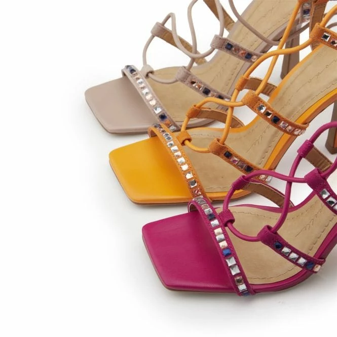 Ride high in Roccoco, the shoe to be seen in. Featuring straps adorned in hot stones, hand placed for a new level of precision. The leather-padded footbed will have you on your feet all night long – whilst the tie straps take the detail up your leg for added impact. Perfect to pair with a dress.