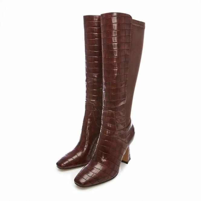 Show up in style with Sarisa. Featuring a stunning swoosh heel knee-high boot is the perfect addition to your shoe collection. The croc effect will effortlessly add texture, whilst the faux fur lining will ensure they feel as glamorous as they look. Style with knitwear.